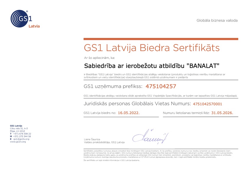 “Banalat” augstos darbības un kvalitātes standartus apliecina