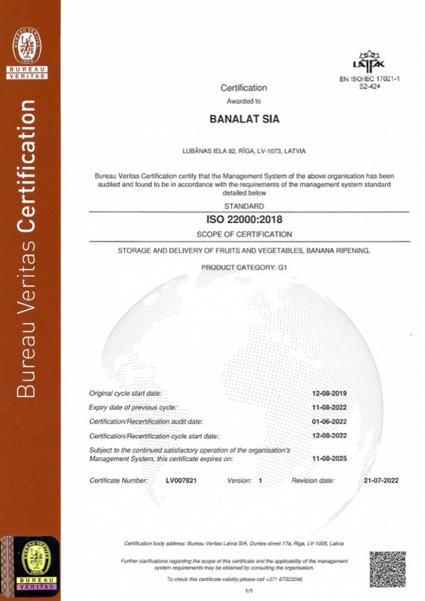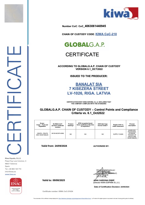 Mūsu uzņēmuma darbinieki ievēro produktu kvalitātes un drošības prasības, gan pieņemot produktu, gan nosūtot to saviem sadarbības partneriem. Mēs strādājam tikai ar produktu, kas atbilst obligātajām kvalitātes prasībām svaigiem augļiem un dārzeņiem (EP un Padomes regulai par (EK) Nr. 852/2004).